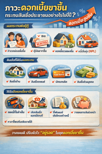 ภาวะดอกเบี้ยขาขึ้นส่งผลกระทบต่อประชาชนในหลายด้าน ทั้งการกู้เงินที่ยากขึ้น ค่างวดที่เพิ่มขึ้น และความเสี่ยงในการเป็นหนี้เสีย การวางแผนการเงินอย่างรอบคอบ และปรับตัวให้ทันสถานการณ์ จึงเป็นสิ่งสำคัญที่จะช่วยให้คุณ “อยู่รอด” และมั่นคงในยุคเศรษฐกิจผันผวนนี้